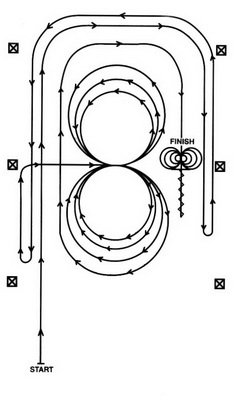 3. Começando na ponta direita, complete dois círculos para a direita: o primeiro sendo grande e rápido; o segundo círculo pequeno e lento. Pare no centro da arena. Pausa.